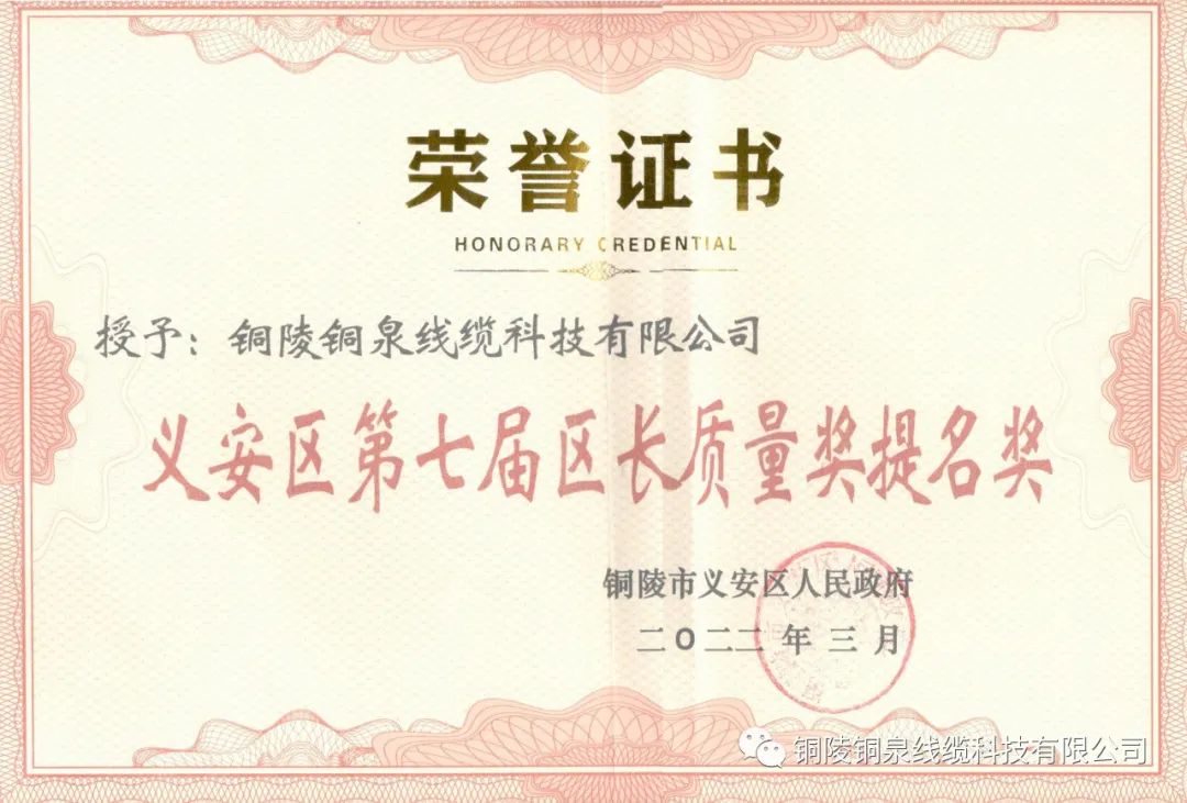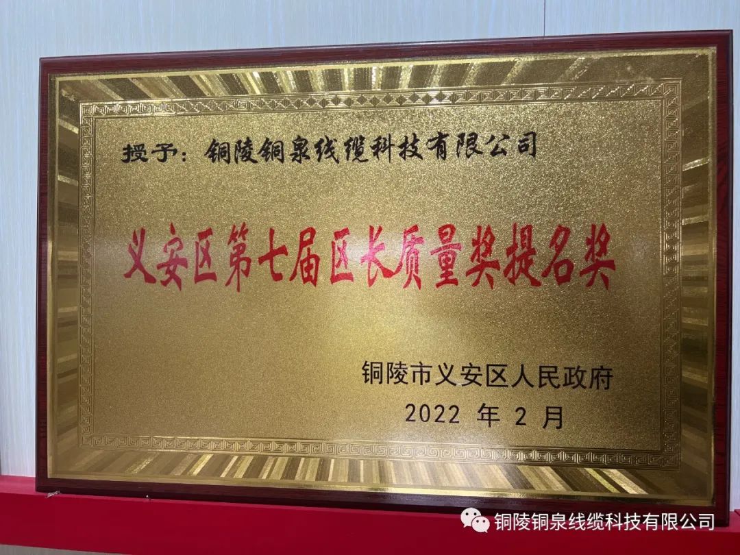 日前,銅陵市義安區(qū)第七屆區(qū)長質(zhì)量獎出爐,銅泉線纜獲評第七屆“義安區(qū)區(qū)長質(zhì)量獎提名獎”,共有2家企業(yè)獲此殊榮。